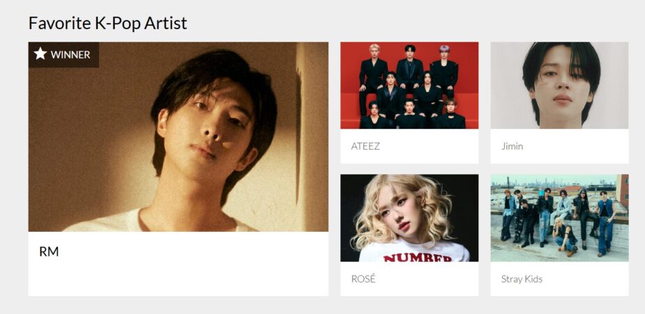 This year’s competition in the Favorite K-Pop Artist category was fierce, featuring notable acts like BLACKPINK’s Rosé, fellow BTS member Jimin, ATEEZ, and Stray Kids. Each of these artists has had a remarkable year with their recent releases, but RM’s victory underscores his exceptional presence in the global music scene.